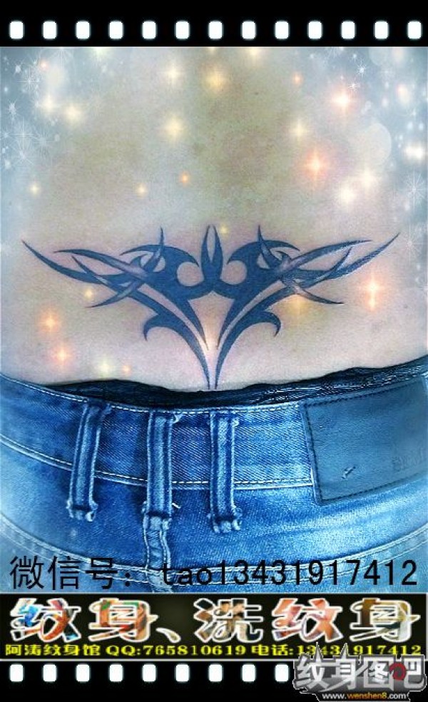 女生后腰纹身黑白灰风格抽象线条纹身图案