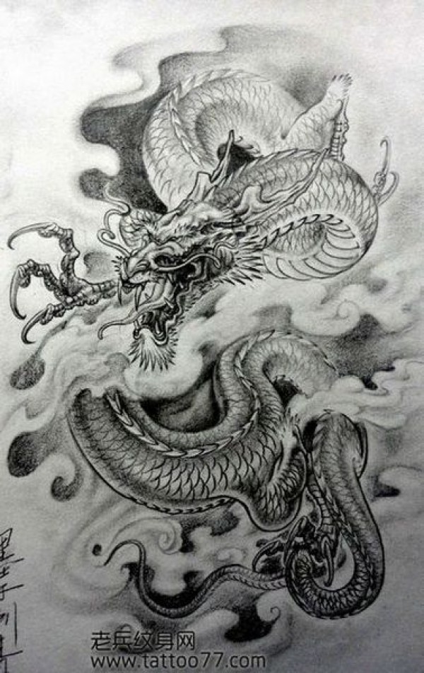 龙纹身手稿_一组老传统黑灰龙手稿纹身图案