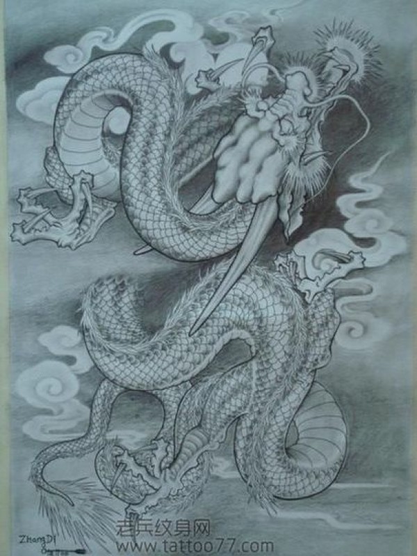 龙纹身手稿_一组老传统黑灰龙手稿纹身图案