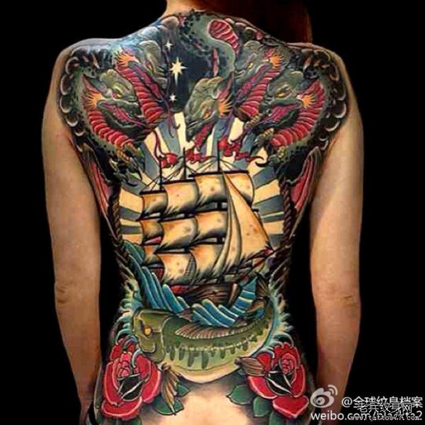 纹身图吧分享一款school风格满背纹身图案