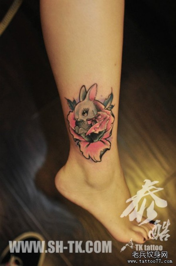 女生腿部可爱的小兔子与玫瑰花纹身图案