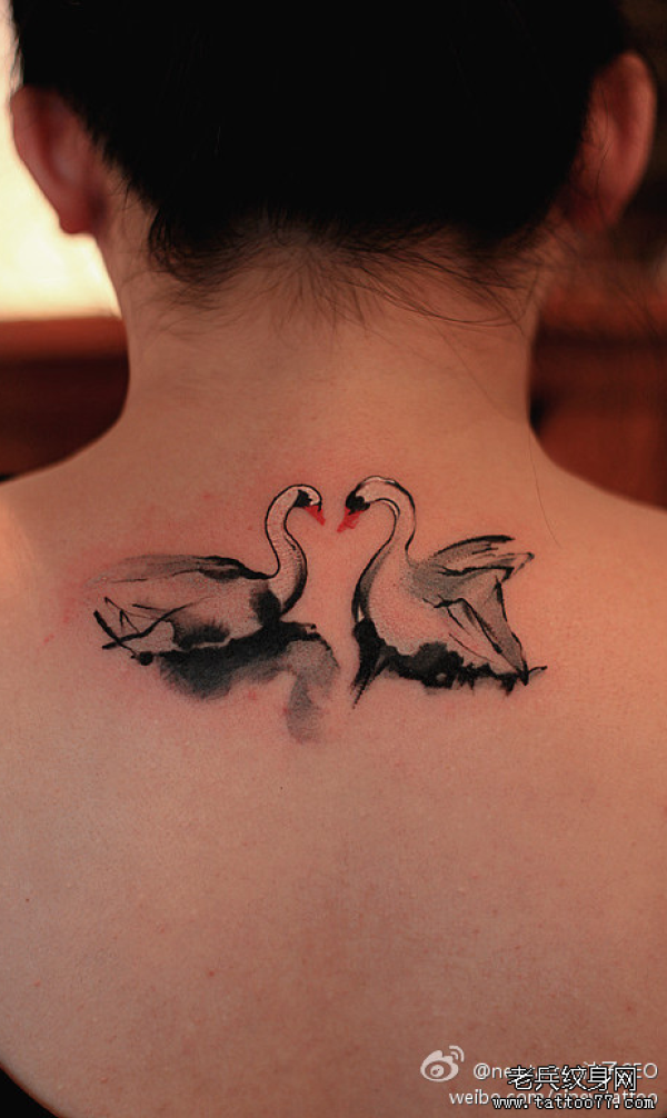纹身图吧分享一款颈部天鹅纹身图案