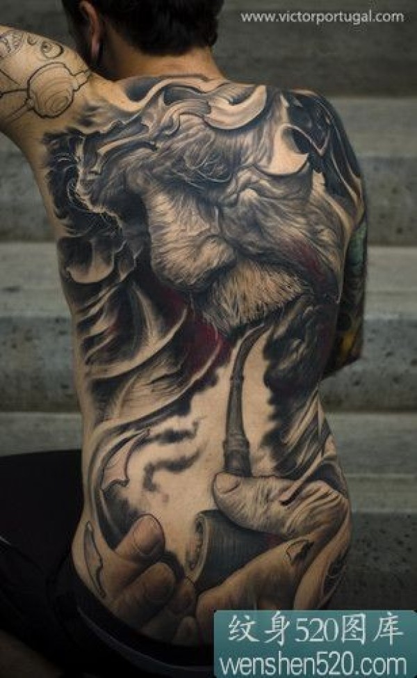 满背霸气抽烟的3d老翁纹身图案