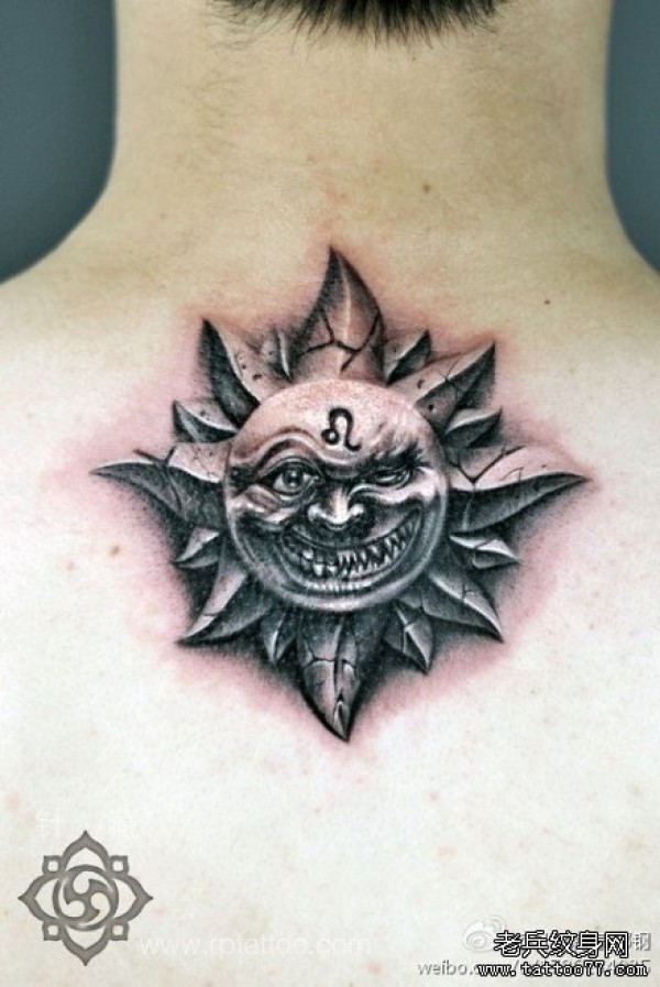 男生颈部超酷的石雕太阳与星座符号纹身图案