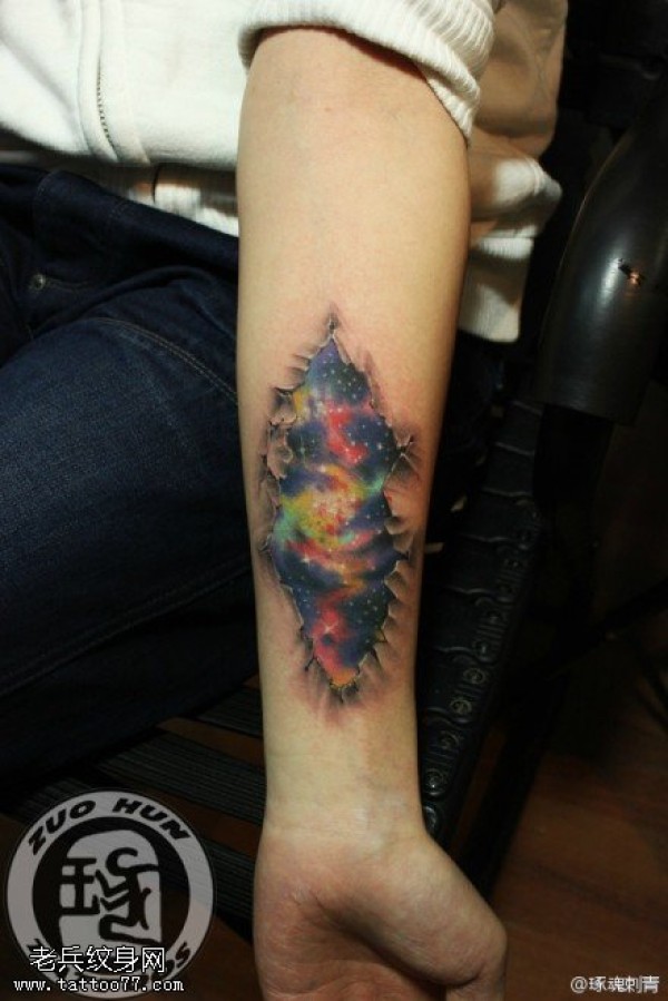 女生手臂彩色星空纹身图案