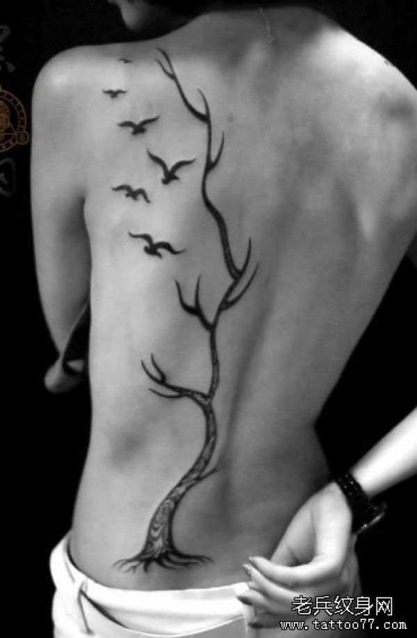 美女背部时尚唯美的图腾树与小鸟纹身图案