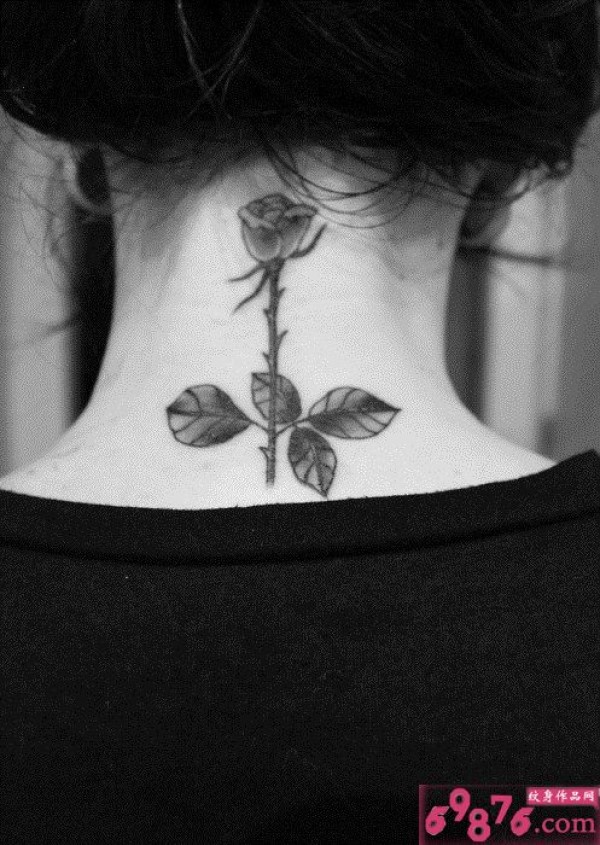 女生后颈黑白玫瑰唯美纹身