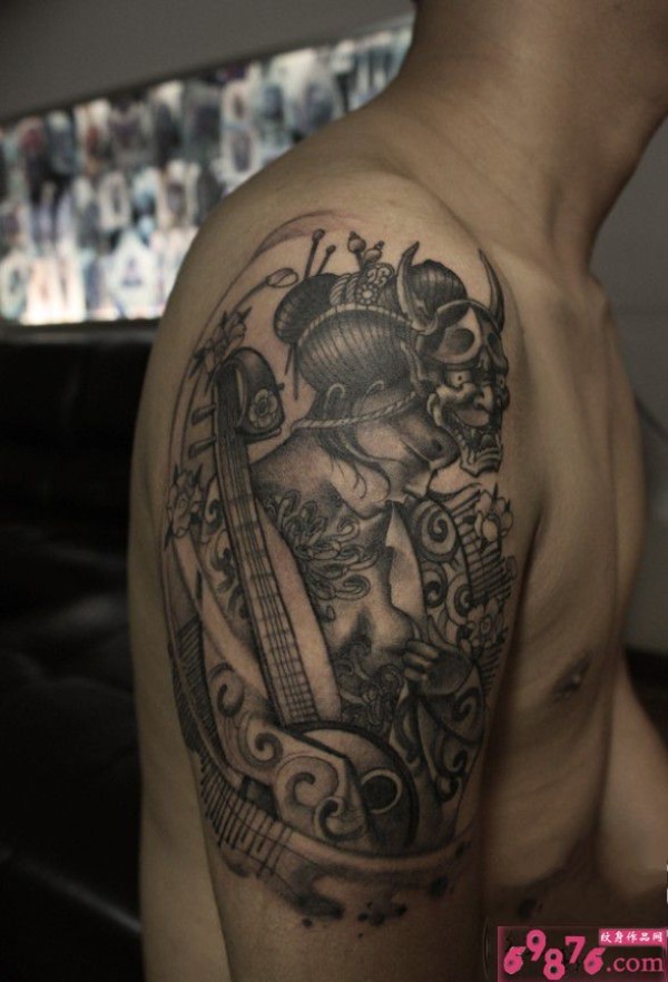 男人大臂黑白彼岸花骷髅_黑白纹身图案大全_纹身图吧