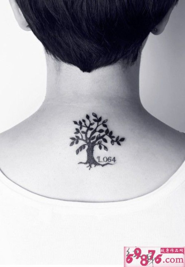 清新黑白小树后颈纹身
