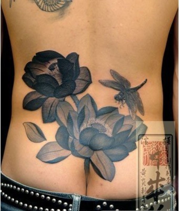 美女后腰个性的黑白蜻蜓荷花纹身图案