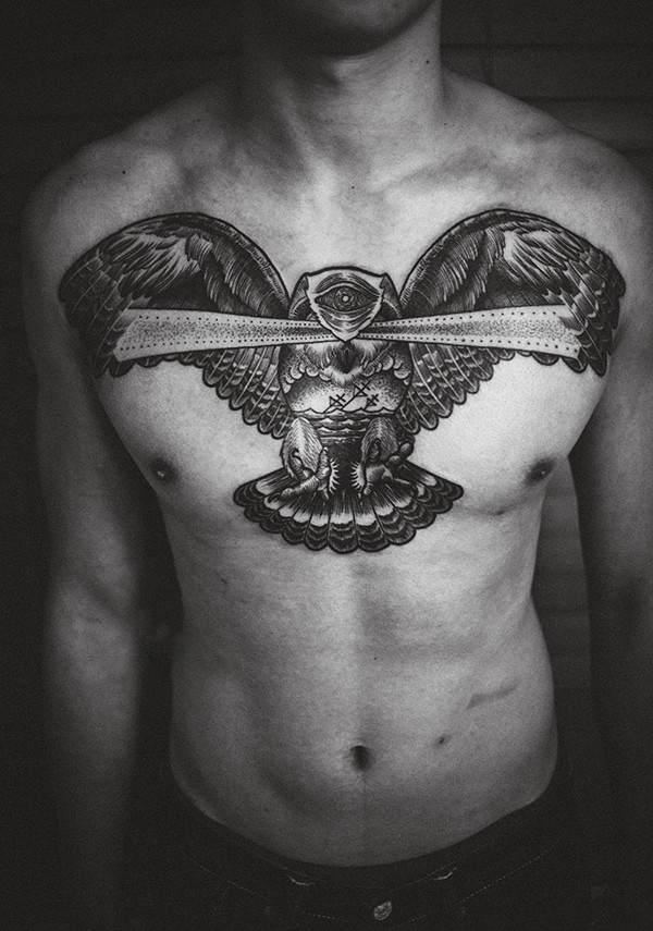 男人胸口霸气三角眼老鹰黑白纹身