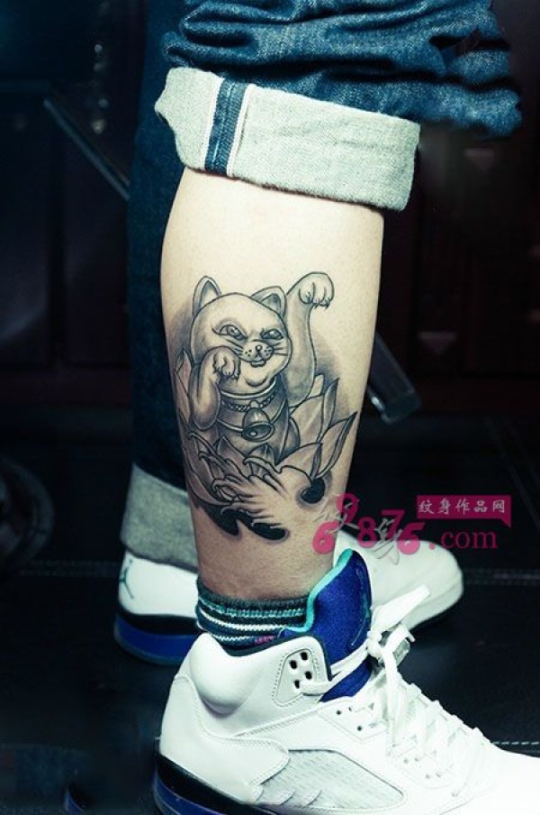 2014招财猫黑白小腿纹身