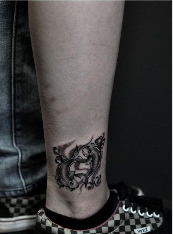 脚踝黑白双鱼座纹身作品图片