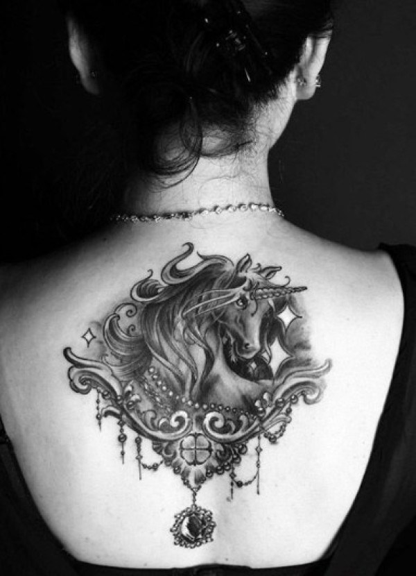 女生后背霸气黑白独角兽纹身作品图片