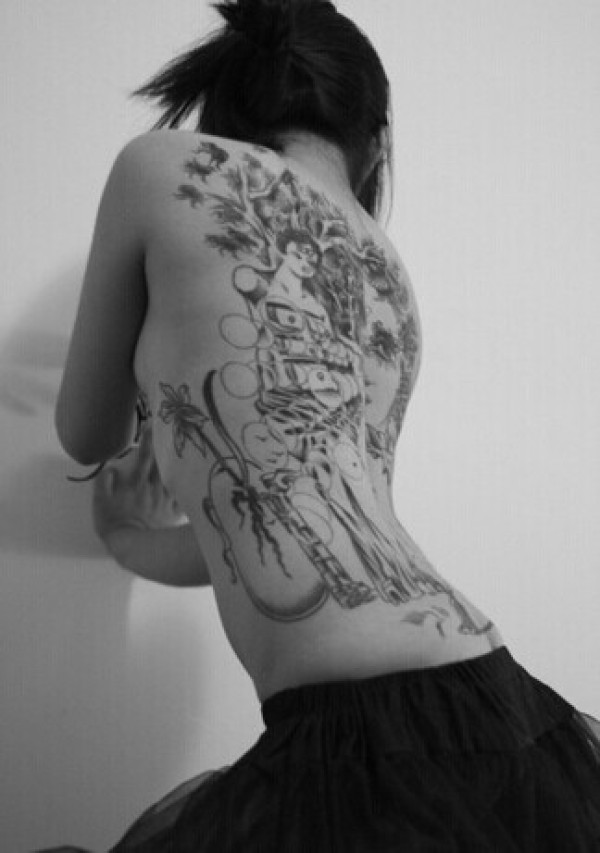 女生后腰纹身黑白灰风格抽象线条纹身图案
