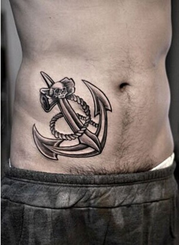 男生腹部经典的黑白船锚纹身图案