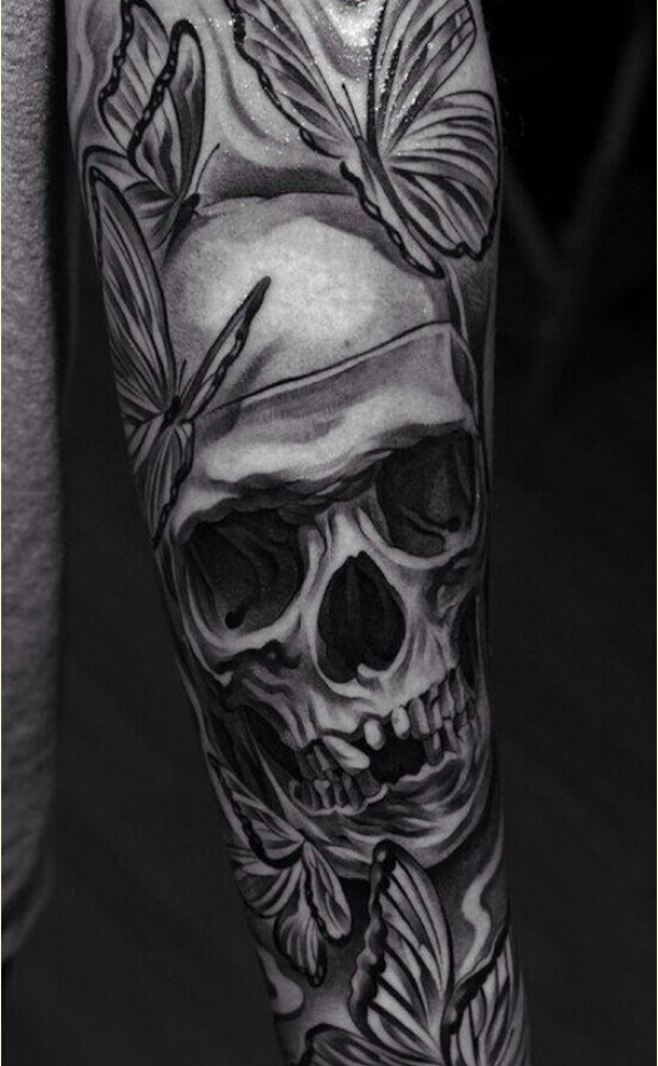 手臂个性黑白骷髅头纹身图案