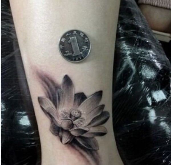 女生小腿部位唯美漂亮的黑白莲花纹身