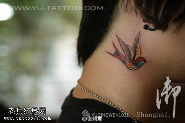 男人脖子彩色燕子刺青图案图片_脖子纹身图案大全_纹身图吧