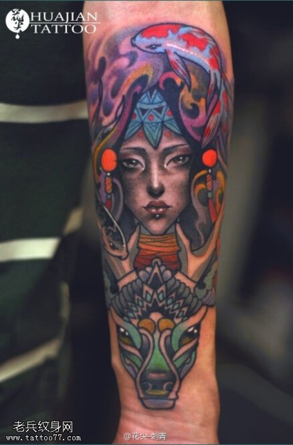 手臂彩色羚羊女郎鲤鱼纹身图片