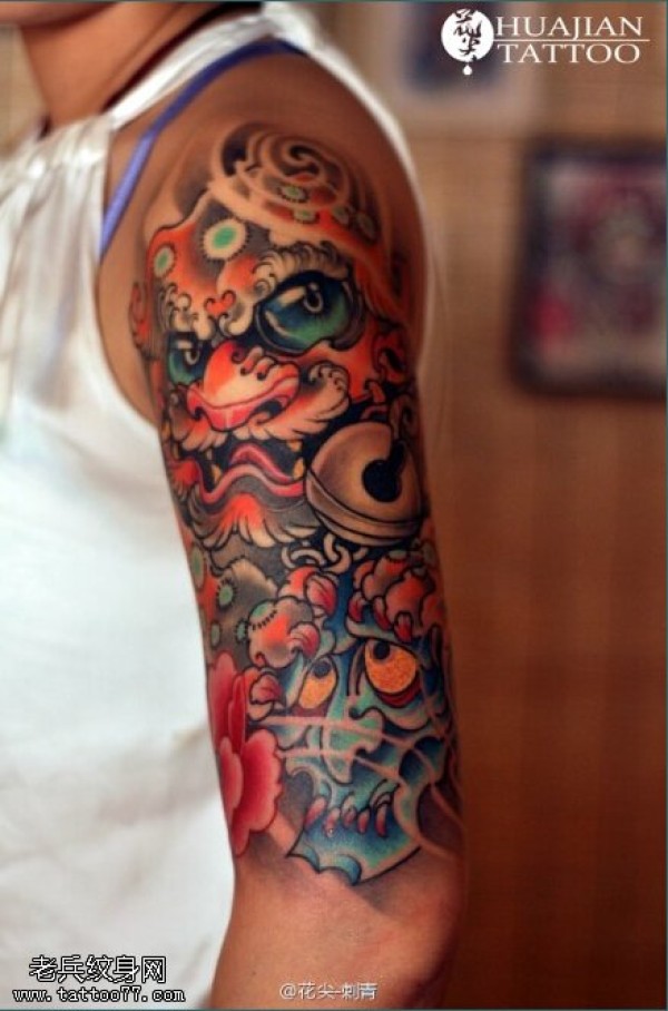 手臂彩色唐狮纹身图片由纹身图吧提供