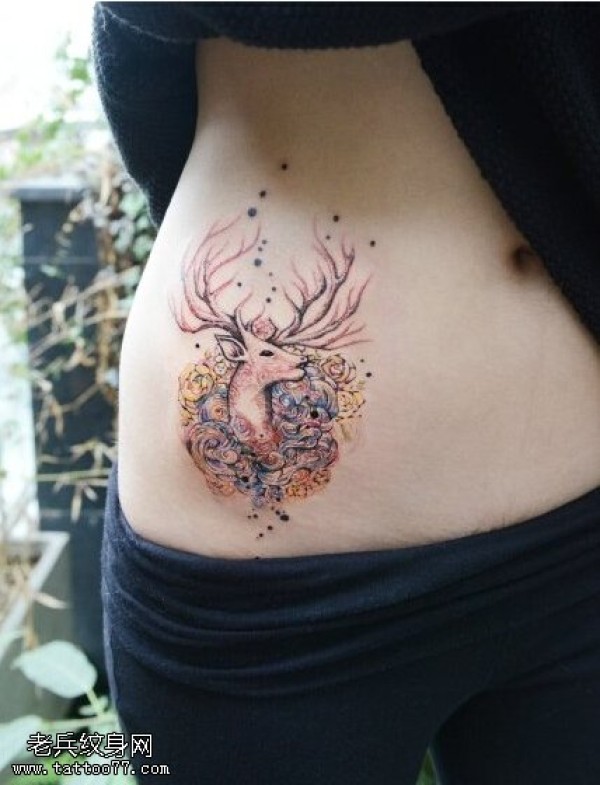 女生腹部彩色羚羊纹身图案由纹身图吧提供