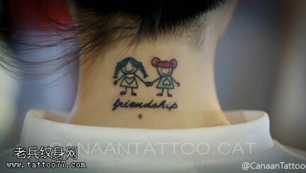 女生颈部彩色卡通娃娃纹身图片