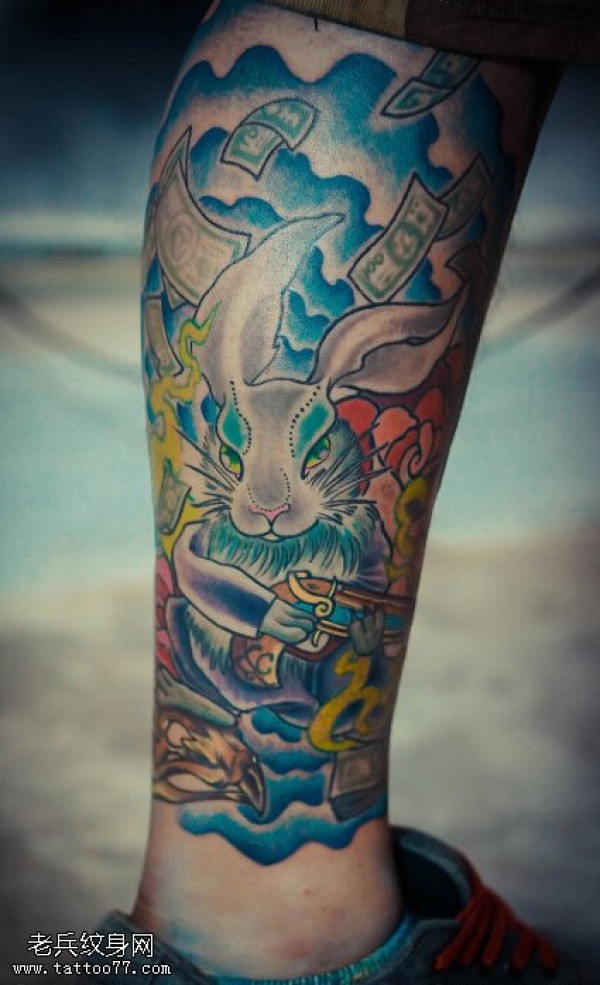 腿部彩色兔子纹身图片