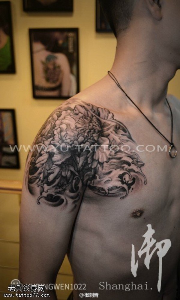 纹身图吧分享一款肩部牡丹花纹身图案