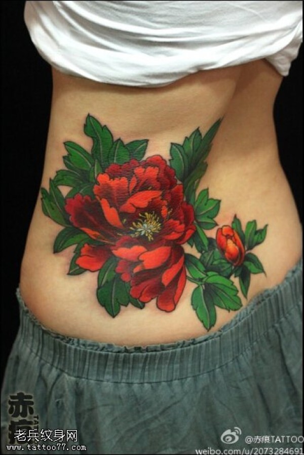 女生腰部彩色牡丹花纹身图片