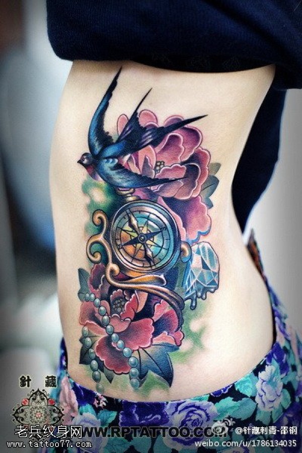 女生腰部彩色燕子指南针牡丹花纹身图案