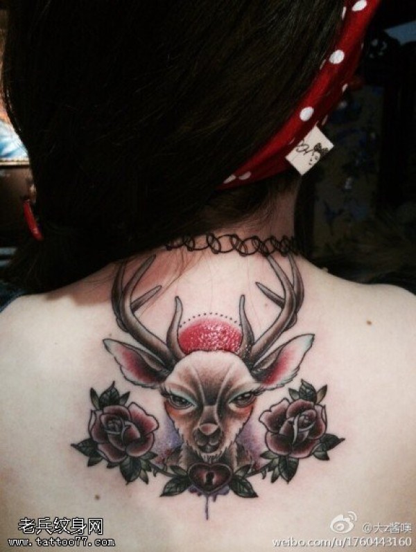 女生背部彩色羚羊玫瑰花纹身图案