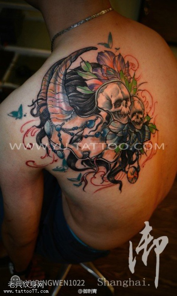 彩色暗黑欧美山羊角的美杜莎纹身图案