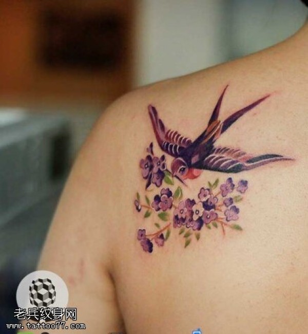 纹身图吧分享一款女生肩部彩色燕子纹身图案