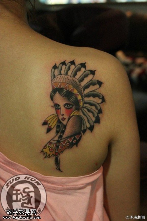 背部彩色女郎纹身图案