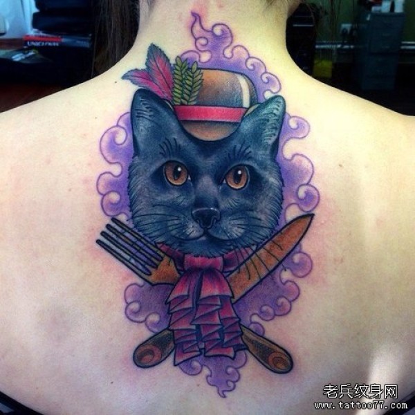 女生背部彩色猫咪纹身图案