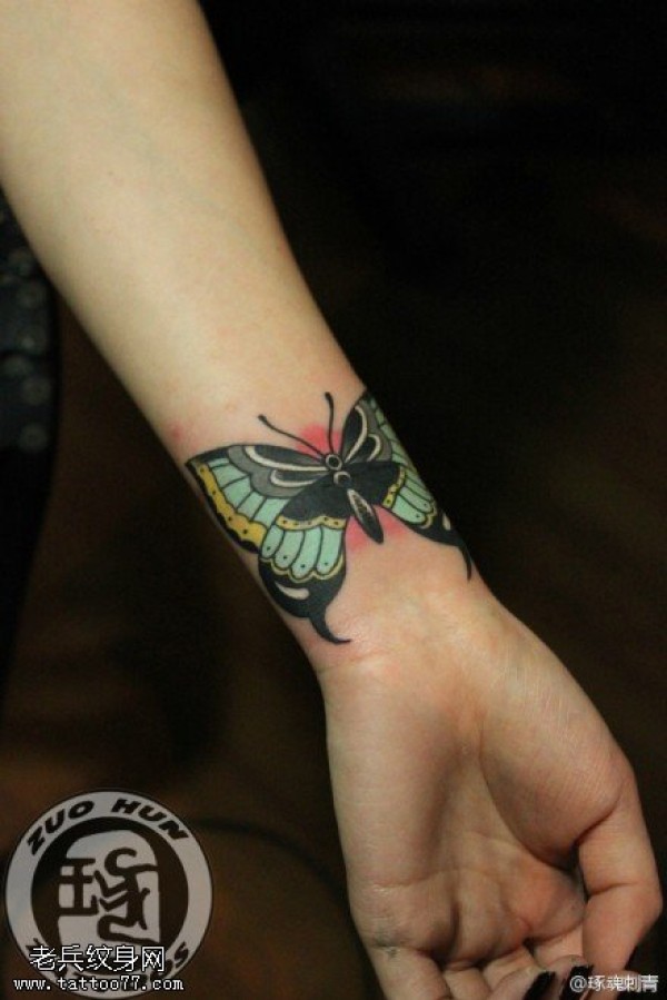女生手腕彩色蝴蝶纹身图案由纹身提供