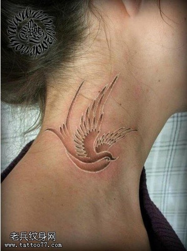 女生颈部白色隐形燕子纹身图案