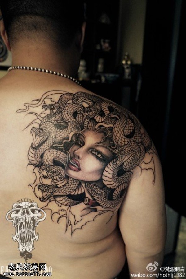背部黑灰美杜莎纹身图案