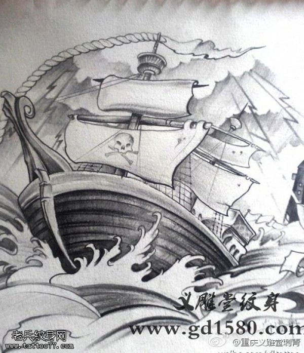 纹身图吧分享一款帆船纹身线稿图片