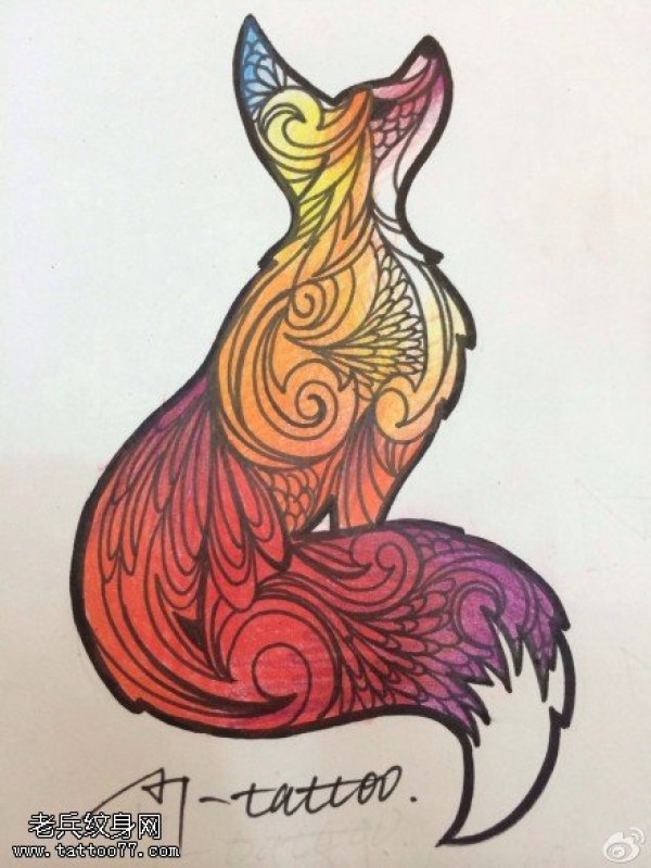 一款彩色小狐狸纹身线稿图片由纹身提供