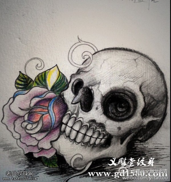 欧美骷髅玫瑰花纹身手稿图片