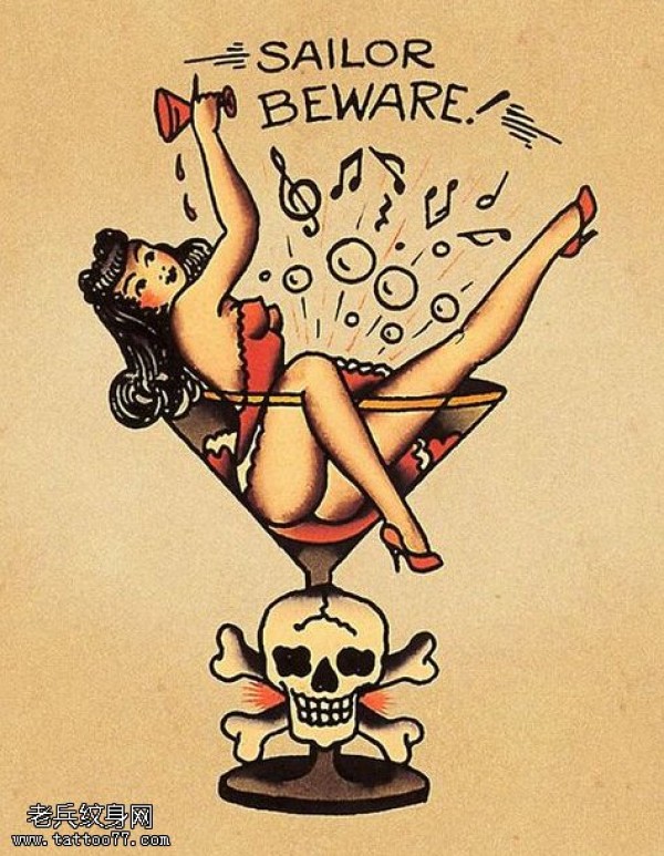 school风格骷髅女郎纹身图案由纹身图吧提供