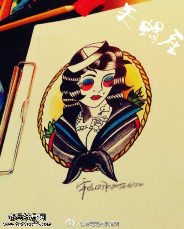 纹身图吧分享一款彩色女郎纹身手稿图案