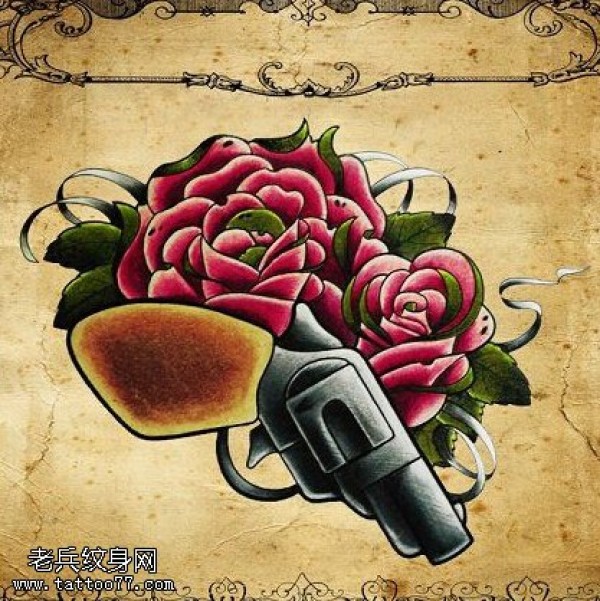 彩色玫瑰花手枪纹身手稿图片