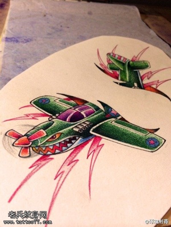 彩色飞机纹身手稿图案由纹身图吧提供