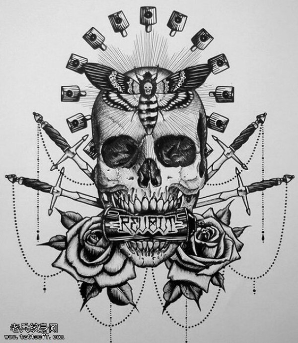 黑灰骷髅玫瑰花匕首纹身手稿图片