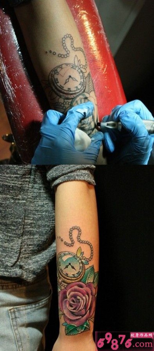 玫瑰复古怀表手臂纹身