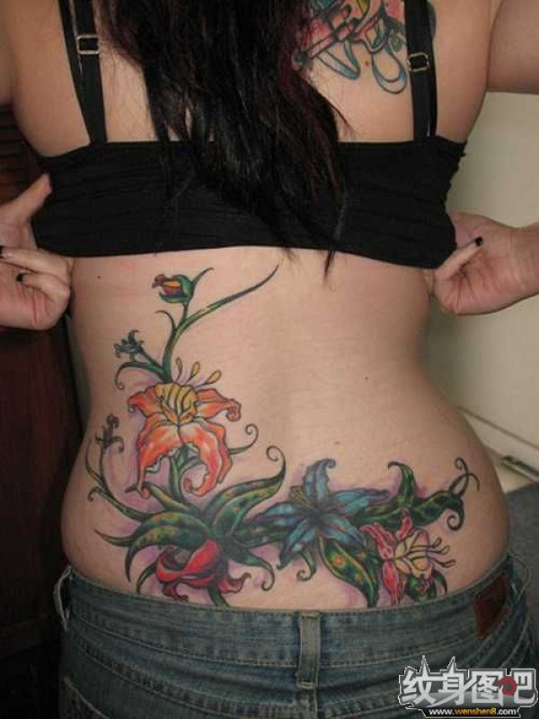 女生玲珑腰部的依兰花图案纹身女生腰部嫣红底_腰部纹身图案大全_纹身图吧