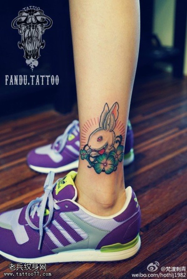 女生脚踝彩色卡通兔子纹身图案